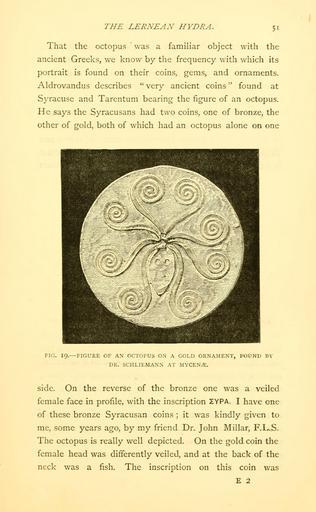 | Keywords: Sea fables explained (15588412752).jpg THE LERNEAN HYDRA <br> 51 <br> That the octopus was a familiar object with the <br> ancient Greeks we know by the frequency with which its <br> portrait is found on their coins gems and ornaments <br> Aldrovandus describes very ancient coins found at <br> Syracuse and Tarentum bearing the figure of an octopus <br> He says the Syracusans had two coins one of bronze the <br> other of gold both of which had an octopus alone on one <br> FIG 19 ” FIGURE OF AN OCTOPUS ON A GOLD ORNAMENT FOUND BY <br> DR SCHLIEMANN AT MYCENiB <br> side On the reverse of the bronze one was a veiled <br> female face in profile with the inscription ZYPA I have one <br> of these bronze Syracusan coins ; it was kindly given to <br> me some years ago by my friend Dr John Millar F L S <br> The octopus is really well depicted On the gold coin the <br> female head was differently veiled and at the back of the <br> neck was a fish The inscription on this coin was <br> E 2 10985657 41337 10456 Page 51 Text http //www biodiversitylibrary org/page/10985657 1883 10 5962/bhl title 10456 International Fisheries Exhibition; Lee Henry NameFound Octopus NameConfirmed Octopus EOLID 38592 NameBankID 2694948 Biodiversity Heritage Library Sea fables explained Squid Octopi Monsters Are Real Folklore Ocean Smithsonian Libraries bhl page 10985657 dc identifier http //biodiversitylibrary org/page/10985657 bhlMonstersRreal Halloween octopus smithsonian libraries bhlmonstersrreal halloween Information field Flickr posted date ISOdate 2014-10-21 CC-BY-2 0 BioDivLibrary https //flickr com/photos/61021753 N02/15588412752 2015-08-25 17 52 10 cc-by-2 0 PD-old-70-1923 Octopus Sea fables explained Photos uploaded from Flickr by Fæ using a script |