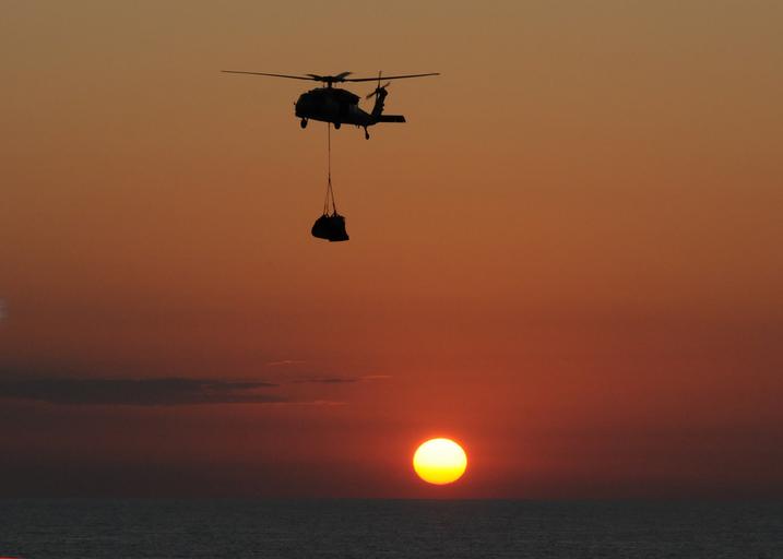 Keywords: sea hawk helicopter sunset aircraft navy sea ocean horizon dusk twilight supplies delivery flying transportation seascape chopper military duty usa