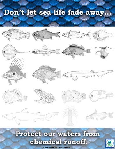 | Keywords: This is a graphic design example promoting clean water. The fading illustrates the concept of fading sea life, and draws the eye to the message. By Clever Fox Website and Graphic Design. ocean life sea inspiration fish water river poster design shark graphic example bayou fade preserve psa chemical conserve runoff |