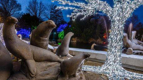 Keywords: sea lion statues christmas lights zoo festive seasonal holiday colorful decorated tree wildlife nature