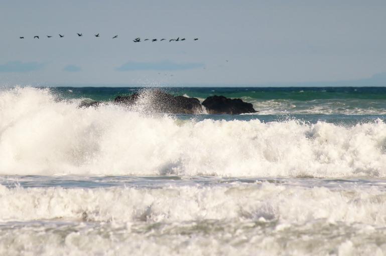 Keywords: sea ocean water wave spray foam rock flock of birds