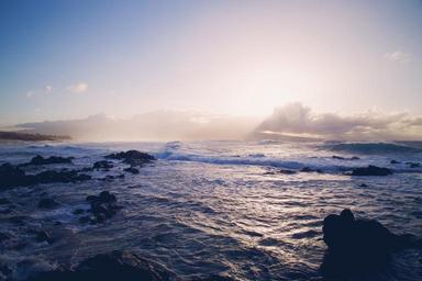 Keywords: sea ocean water waves shorebreak breakwater nature wild rocks stones scene sunset evening dusk reflection horizon coast shore