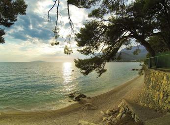 Keywords: sea tree beach pavement stairs stones wall clouds sky green blue black holidays mediterranean summer heat