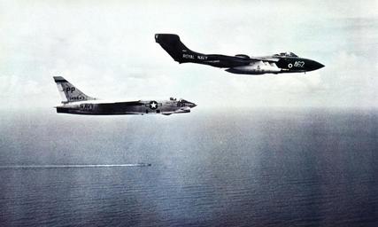 Keywords: Sea Vixen FAW2 of 893 NAS in flight with RF-8A Crusader of VFP-63 on May 1964.jpg A U S Navy Vought RF-8A Crusader BuNo 145643 from Photographic Reconnaissance Squadron 63 VFP-63 Det B Eyes of the Fleet in flight with a Royal Navy De Havilland Sea Vixen FAW 2 from 893 Naval Air Squadron VFP-63 Det B was assigned to Attack Carrier Air Wing 5 CVW-5 aboard the aircraft carrier USS Ticonderoga CVA-14 for a deployment to the Western Pacific and Vietnam from 14 April to 15 December 1964 893 NAS was assigned to HMS Victorious R38 Both carriers took part in a SEATO exercise off the Philippines in May 1964 U S Navy photo http //www navysite de/cruisebooks/cv14-64/101 htm from the http //www navysite de/cruisebooks/cv14-64/index_004 htm USS Ticonderoga CVA-14 1964 cruise book available at http //navysite de/cruisebooks/index html Navysite de 1964-05 U S Navy PD-USGov-Military-Navy De Havilland Sea Vixen RF-8 Crusader 893 Naval Air Squadron Photographic Reconnaissance Squadron 63 United States Navy LIGTAS 1964 military exercise