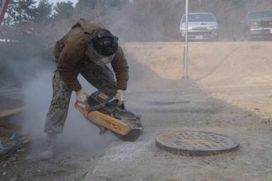 | Keywords: Seabees continue humanitarian work, construction operations in Pacific 140222-N-QJ900-394.jpg en A Seabee from Naval Mobile Construction Battalion 1 Detail Chinhae cuts into concrete slabs during construction operations Feb 22 NMCB 1 Detail Chinhae is tasked with preparing a side road to the Turtle Cove Dining Facility where the Republic of Korea contractors will lay asphalt Aligned with Secretary of the Navy Ray Mabus' four priorities of people platforms partnerships and power NMCB 1 will deliver the Navy's forward presence through its work with several host nations at its CCADs in the Pacific and will continue to conduct construction operations in the Northern Command U S Navy photo by Aviation Boatswain's Mate 3rd Class Leanna Manke/Released <br>Unit Naval Mobile Construction Battalion 1 2014-02-23 NMCB https //www dvidshub net/image/1177518/seabees-continue-humanitarian-work-construction-operations-pacific 140222-N-QJ900-394 2014-03-02 01 24 CHINHAE KR PD-USGov-Military-Navy Photographs by Defense Video and Imagery Distribution System Ray Mabus in 2014 Images from DoD uploaded by Fæ |
