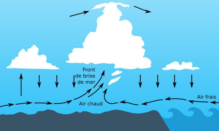 | Keywords: SeaBreeze-fr.svg Schematic cross section through a sea breeze front If the air inland is moist cumulus often marks the front Le réchauffement de l'air au-dessus de la terre est plus rapide que celui au-dessus de la mer suite à la différence de capacité thermique entre les deux milieux Par ciel clair de jour il s'en suit un flux d'air qui est montré sur ce diagramme L'air chaud étant moins dense peut être repoussé en altitude par l'air plus frais venant de la mer le long du front de brise de mer Ce denier sera le plus souvent visible grâce à la présence de nuages convectifs de types cumulus si l'air chaud est assez humide En aval et en amont de ce front se trouvent par contre des zones de subsidence de l'air et donc un ciel généralement dégagé 2011-10-21 19 53 UTC SeaBreeze svg SeaBreeze svg SeaBreeze jpg U S FAA AC 00-6A Chapter 16 Figure 165 derivative work Malyszkz derivative work M0tty v fl Translation in French M0tty SeaBreeze svg Atelier graphique Schematic cross section through a sea breeze front If the air inland is moist cumulus often marks the front 2011-10-17 08 04 </nowiki> Uploaded with derivativeFX Sea and land breezes |