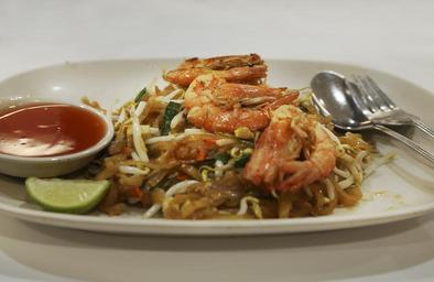 Keywords: seafood prawns shrimps fried roasted food meal restaurant dish cuisine crustacean sauce plate spoon fork cutlery