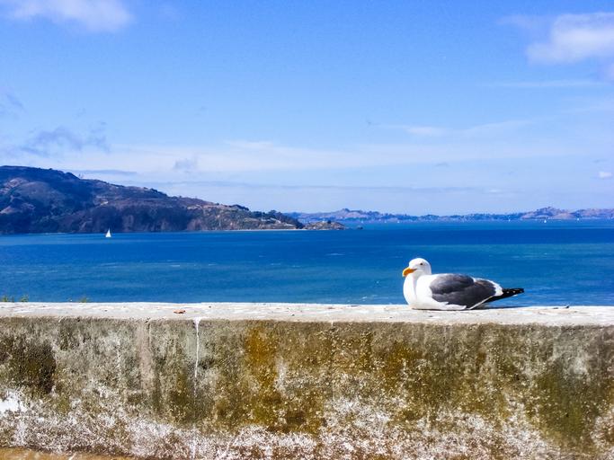Keywords: seagull bird feather water ocean seagulls pacific nature san francisco bay san francisco harbor california outside alcatraz island bay blue mountains sailboat wall clouds