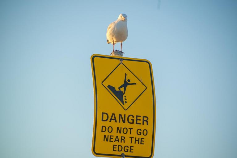 Keywords: seagull bird gull shore bird perched perching white aves avian fauna avifauna danger sign sign post warning australia
