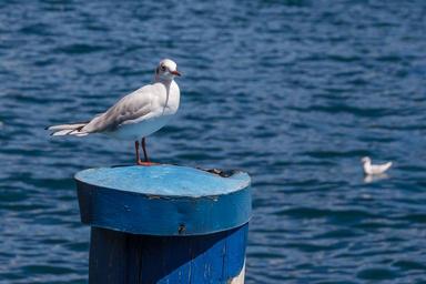 Keywords: seagull bird pile water seevogel wood pile port blue