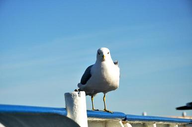 Keywords: seagull blue-sky blue sky bird standing looking-at-camera looking still confident white serious posing