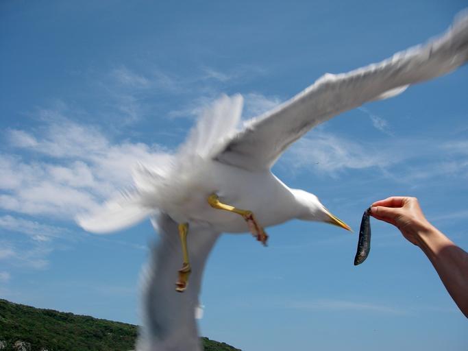 Keywords: seagull sea bird fish hand feed animal water wind water bird coast blue ocean seevogel white clouds summer holiday