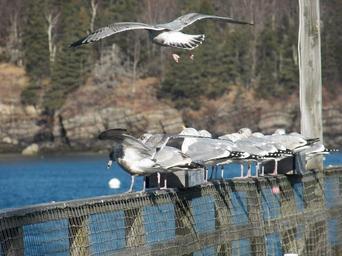 Keywords: seagull seagulls bird birds feather feathers animal animals fly flying flight soaring pier dock fence rail railing ocean sea bay harbor water wildlife