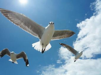 Keywords: seagull sky blue flying gull nature bird wing high freedom wildlife feather flight cloud air sun ocean sunny