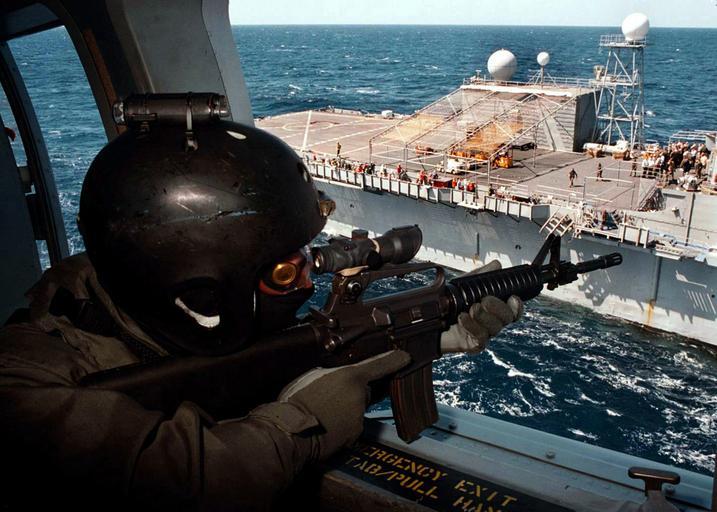 | Keywords: SEAL search and seizure training.jpg en 960520-N-2381V-001 U S Navy Lt Kevin McVadon from Great Falls Virginia assigned to Sea Air Land SEAL Team Eight covers his squad from an SH-60 helicopter during a Helicopter Visit Board Search and Seizure HVBSS exercise on board Commander Sixth Fleet Command ship USS LaSalle AGF 3 May 20 1996 U S Navy photo by Photographer's Mate Chris Vickers Released 960520-N-2381V-001 Navy http //www navy mil/view_image asp id 411 U S Navy photo by Photographer's Mate Chris Vickers PD-USGov-Military-Navy United States Navy SEALs Aboard USS La Salle AGF-3 Advanced Combat Optical Gunsight on M4 carbine Visit Board Search and Seizure SH-60 Seahawk SEAL Team 8 |