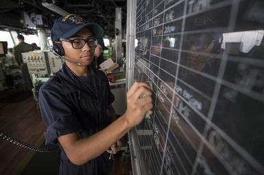 | Keywords: Seaman updates navigational information on the bridge of USS Bonhomme Richard. (30193090351).jpg SOUTH CHINA SEA Oct 12 2016 Seaman Kyren Mounsombath updates navigational information on the bridge of the amphibious assault ship USS Bonhomme Richard LHD 6 Bonhomme Richard flagship of the Bonhomme Richard Expeditionary Strike Group is in the South China Sea to support security and stability in the Indo-Asia Pacific region U S Navy photo by Petty Officer 1st Class David Holmes Released 161012-N-JS726-01 Join the conversation http //www navy mil/viewGallery asp www navy mil/viewGallery asp http //www facebook com/USNavy www facebook com/USNavy http //www twitter com/USNavy www twitter com/USNavy http //navylive dodlive mil navylive dodlive mil http //pinterest com pinterest com https //plus google com plus google com https //www flickr com/photos/usnavy/30193090351/ Seaman updates navigational information on the bridge of USS Bonhomme Richard 2016-10-12 15 24 https //www flickr com/people/56594044 N06 Official U S Navy Page from United States of America PO1 David Holmes/NPASE Japan/USS Bonohomme Richard LHD 6 Attribution License IPTC Caption-Abstract U S Navy photo PD-USGov-Military-Navy Official U S Navy Imagery https //flickr com/photos/56594044 N06/30193090351 2016-10-13 20 50 38 cc-by-2 0 161012-N-JS726-01 Navy Aboard USS Bonhomme Richard LHD-6 Files from the U S Navy Flickr stream Photographs taken on 2016-10-12 Taken with Nikon D4S |