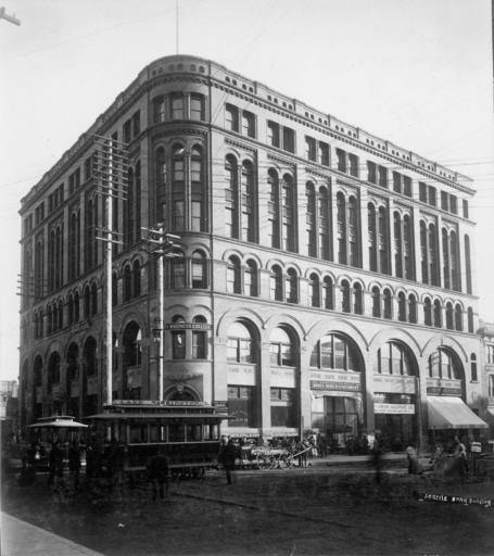 | Keywords: Seattle National Bank Building, southeast corner of Yesler Way and S 2nd Ave, Seattle, Washington, ca 1891 (LAROCHE 323).jpeg Pioneer Square-Skid Road Photograph Creator Frank La Roche Caption on image Seattle Bank Building Also known as the Pacific Block and the Interurban Building Subjects LCTGM Street railroads--Washington State --Seattle; Carriages coaches--Washington State --Seattle Subjects LCSH Seattle National Bank Building Seattle Wash ; Yesler Way Seattle Wash ; Second Avenue Seattle Wash ca 1891 Institution University of Washington UWASH-LAROCHE-source accession number laroche 323 PD-old-auto-1923 1936 Information field Order Number LAR107 Interurban Building Streetcars in Seattle historic Seattle Washington in the 1890s Black and white photographs |