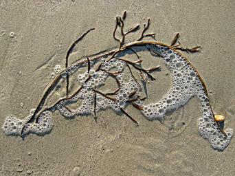 Keywords: seaweed sand bubble sea weed beach marine shore shoreline tide water flow pebble stranded creature monster pattern surface tension foam spume wet lather