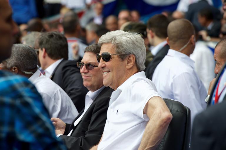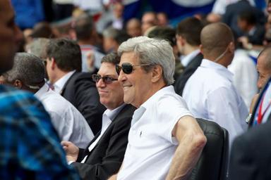 | Keywords: U.S. Secretary of State John Kerry sits with Cuban Foreign Minister Bruno Rodriguez Parrilla at the Estadio Latinoamericano in Havana, Cuba, as he and members of a U.S. delegation led by President Obama attend an exhibition game on March 22, 2016, between the Cuban National Baseball Team and the Tampa Bay Rays. [State Department photo/ Public Domain] secretarykerryhavanacubapresidentobamabaseballcastro | ||||