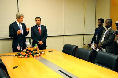 | Keywords: Secretary Kerry and Ethiopian Foreign Minister Adhanom Hold a News Conference in Addis Ababa (2).jpg en U S Secretary of State John Kerry takes a question from an African journalist as the Secretary and Ethiopian Foreign Minister Tedros Adhanom hold a news conference at the 50th anniversary African Union Summit in Addis Ababa Ethiopia on May 25 2013 State Department photo/ Public Domain 2013-05-25 02 20 33 http //www flickr com/photos/statephotos/8814697419/sizes/o/in/photostream/ U S Department of State U S Department of State http //flickr com/photos/9364837 N06/8814697419 2013-05-25 17 06 37 United States Government Work PD-USGov Tedros Adhanom Ghebreyesus Uploaded with UploadWizard John Kerry visit to Ethiopia May 2013 |
