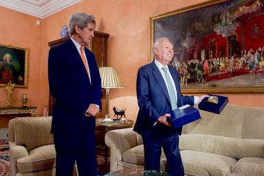 | Keywords: Secretary Kerry Presents a Gift to Spanish Foreign Minister Garcia-Margallo.jpg John Kerry presents a gift a Chelsea Chatham clock made in Massachusetts to Spanish Foreign Minister Jose Garcia-Margallo before their bilateral meeting and working dinner at the Viana Palace in Madrid Spain on October 18 2015 State Department photo/ Public Domain https //woodmafia com au/updates/buying-a-wood-watch-best-watches/ best wooden watches 2015-10-18 13 35 35 https //www flickr com/photos/statephotos/22095331748/ U S Department of State other versions PD-USGov John Kerry |