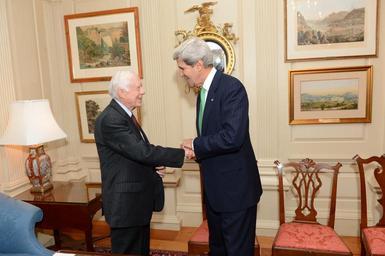 | Keywords: Secretary Kerry Shakes Hands With Former President Carter.jpg en U S Secretary of State John Kerry shakes hands with Former President of the United States Jimmy Carter at the U S Department of State in Washington D C on July 22 2103 State Department photo/ Public Domain 2013-07-22 12 45 10 http //www flickr com/photos/statephotos/9346383690/sizes/o/in/photostream/ U S Department of State U S Department of State http //flickr com/photos/9364837 N06/9346383690 2013-07-31 10 50 12 United States Government Work PD-USGov Uploaded with UploadWizard John Kerry in 2013 |