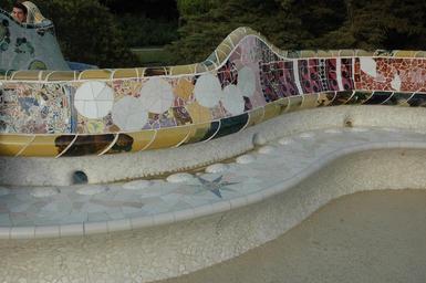 Keywords: Sedile al Parco Güell (Barcelona 2010).jpg it Supporto in muratura modellato manualmente Antoni Gaudí produzione propria Piergiorgio Rossi apr 2010 Mosaics in main square of Parc Güell