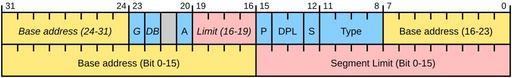 | Keywords: SegmentDescriptor.svg Segment descriptor format for a protected mode segment descriptor on 286-compatible CPUs The italic fields are added in the 32-bit protected mode of the 80386 processor<br /> S System segment 0 System 1 code or data DPL Descriptor privilege level P Segment present A Freely available for use by system software DB Default operand size 0 16 bit 1 32 bit G Granularity of segment limit 0 segment limit counts bytes 1 segment limit counts 4-KiB units Type Describes what type a segment is Such as if it is a code segment or not OR whether it is operating under read write or execute privileges etc selfmade work 2007-01-24 Lars H Rohwedder User RokerHRO selfmade work Intel microprocessors Operating systems |