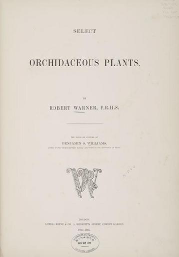 Keywords: Select Orchidaceous Plants - First series - title page.jpg Title page of Select orchidaceous plants first series <br> http //www botanicus org/page/269392 1862-1865 Walter Hood Fitch 1817 - 1892 illustrator <br> Robert Warner 1814-1896 and Benjamin Samuel Williams 1822-1890 editors <br> PD-Art Robert Warner - Select Orchidaceous Plants |