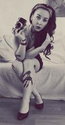 Keywords: self-portrait feet hair one breast girl woman eyes camera face lady tenderness