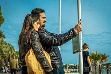 Keywords: selfie man woman couple beach palm trees sunny phone photo palm summer relaxing smartphone outdoors communication mobile people female male person on phone mobile phone technology cell phone cellphone adult lady person