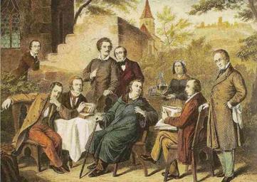 | Keywords: Seracher Dichterkreis.jpg Graf Alexander von Württemberg und seine Dichterfreunde im Garten Justinus Kerners in Weinsberg Von links Theobald Kerner Nikolaus Lenau Gustav Schwab Graf Alexander von Württemberg Karl Mayer Justinus Kerner Friederike Kerner Ludwig Uhland Karl August Varnhagen von Ense http //www goethezeitportal de/index php id 6422 Goethezeitportal 1866 kolorierter Stich nach einem verschollenen Ölgemälde von Heinrich von Rustige 1810 “1900 Reproduction of a painting that is in the public domain because of its age File Die Gartenlaube 1866 b 005 jpg PD-old-100 Weinsberg Alexander of Württemberg 1801 “1844 Justinus Kerner Theobald Kerner Friederike Kerner Ludwig Uhland Karl August Varnhagen von Ense Nikolaus Lenau Gustav Schwab Heinrich von Rustige |
