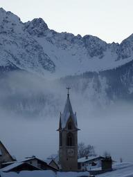 Keywords: serfaus austria ski resort church snow fog mountains dawn bell tower cold white mountain landscape winter nature