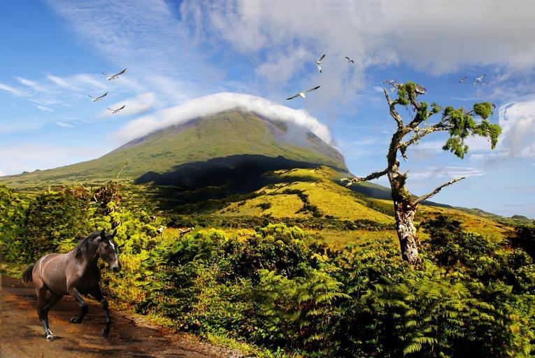 Keywords: serra mountains blue sky clouds trees vegetation nature horse animal bird environment