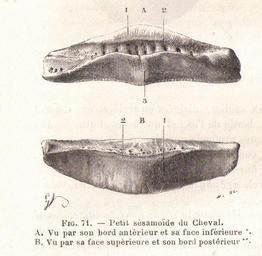 | Keywords: SesamoidePtChevalChauveau1980.jpg en Descr Ang The small sesamoid bone of the horse Equus caballus fr Le petit sésamoïde Os sesamoidum phalangis distalis de cheval Equus caballus A vu par son bord antérieur et sa face inférieure B vu par son bord postérieur et sa face supérieure <br /> - A vu par son bord proximal ou antérieur Margo proximalis et sa face inférieure <br /> 1 facette articulaire du bord antérieur correspondant à la facette du bord postérieur de la 3e phalange <br /> 2 sillon rugueux du bord antérieur <br /> 3 face inférieure lisse et ondulée <br /> - B vu par son bord distal ou postérieur Margo distalis et sa face supérieure <br /> 1 surface articulaire Facies articularis de la face supérieure correspondant à l'extrémité inférieure de la 2e phalange <br /> 2 bord postérieur parsemé d'orifices vasculaires <br /> ” Chauveau Auguste Arloing Saturnin Traité d'anatomie comparée des animaux domestiques 1 064 p page 126 1890 Paris Lib J B Baillière et Fils domaine public décès des auteurs 1917 et 1911 Meyer C 2011-03-12 PD-old Horse bones |