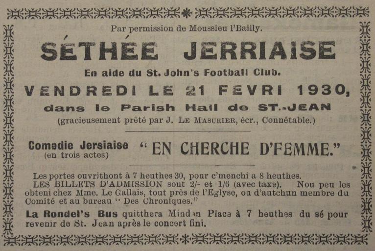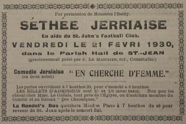 | Keywords: Séthée Jèrriaise 21 Févri 1930.jpg Séthée Jèrriaise Jèrri 21 Févri 1930 En Cherche d'Femme own photo 2010-02-19 13 39 51 Man vyi PD-old PD-1996 Theatre of Jersey 1930 in theatre Jèrriais Advertisements in Jersey Edwin J Luce Elie Town halls in Jersey Saint John Jersey February 1930 in Europe |