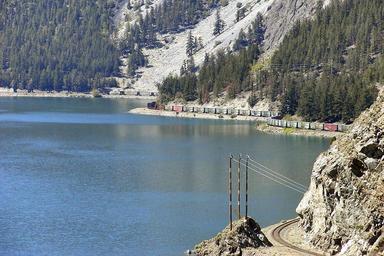 Keywords: seton lake lillooet british columbia canada landscape scenery haze water lake railroad shore line train