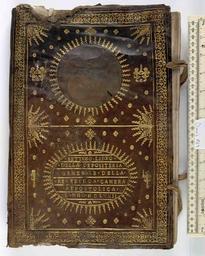 Keywords: Settimo libro della depositeria generale della Reverenda Camera Appostolica lanno 1572 -Manuscript on paper- - Upper cover (Davis869).jpg Style Circle Lettered cover eg intitals titles; Caption Upper cover; Colour Brown; Edge Plain exhibition history Decorative Technique Tooled in blind Tooled in gold; Cover Material Goatskin includes morocco turkey etc Traces of 2 pairs of ties Possibly by Francesco Soresino c1572 binder to the Vatican after the death of Niccolo Franzese object history Text 1572; Rome; Unspecified object type Cc-zero place of creation Binding Italy place of discovery M M Foot The Henry Davis Gift vol III London 2010 p 409 British Library image http //www bl uk/catalogues/bookbindings/LargeImage aspx RecordId 020-000002170 ImageId ImageId 40690 Copyright BL Settimo libro della depositeria generale della Reverenda Camera Appostolica lanno 1572 Manuscript on paper Uploaded with GWToolset Settimo libro della depositeria generale della Reverenda Camera Appostolica lanno 1572 Manuscript on paper - Upper cover Davis869 http //www webarchive org uk/bldatasets/bindings/7192_4 jpg Bookbinding 16th-century bookbinding British Library Bookbindings