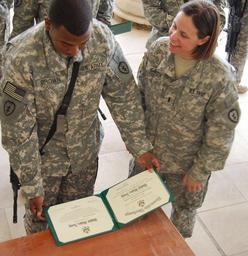 | Keywords: Seven Gimlets volunteer to stay Army DVIDS82529.jpg en Spc Derric Brown native of Victorville Calif and member of the Forward Area Support Team assigned to Company A 225th Brigade Support Battalion 2nd Stryker Brigade Combat Team Warrior 25th Infantry Division Multi-National Division “ Baghdad signs his re-enlistment certificate at the Al Faw Palace March 28 as his re-enlistment officer 1st Lt Michelle Garcia a native of Omaha Neb who serves as the forward area support coordinating officer for 1st Battalion 21st Infantry regiment Gimlets 2nd Stryker Cavalry Regiment MND-B looks on U S Army photo/SPC Dustin Weidman 2008-03-28 https //www dvidshub net/image/82529 82529 2008-04-01 15 30 VICTORY BASE COMPLEX IQ PD-USGov Victory Base Complex 21st Infantry Regiment United States 25th Infantry Division United States Al-Faw Palace Images from DoD uploaded by Fæ |