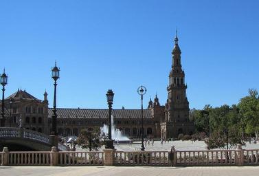 Keywords: sevilla children's spanish church tower architecture monument the museum figure mudejar style renaissance style baroque square fountain lights penthouse sunny heat spain building historic railing people towers bridge