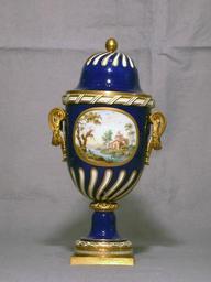 | Keywords: Sèvres Porcelain Manufactory - One of a Pair of Vases (Vase à feuilles de laurier) - Walters 48625 - Back.jpg Walters Art Museum artwork Creator Manufacture nationale de Sèvres This vase and its pair Walters 48 626 are in bleu nouveau and have handles in the form of rings of laurel leaves The vases are decorated with panels showing amorous shepherds and shepherdesses Pithou the elder painted these scenes after Francois Boucher's paintings La Musique pastorale and Les Amusements de la campagne 1743 1772 soft-paste porcelain cm 32 6 accession number 48 625 2104 Collection of Sir Anthony Rothschild according to Hodgkins remains to be verified E M Hodgkins Collection Paris no 50 date and mode of acquisition unknown A Seligmann Rey and Co New York Henry Walters city Baltimore Walters Art Museum Henry Walters Acquired by Henry Walters 1928 Visible marks Factory mark Intertwined Lls; Date Letter T 1772 place of origin Sèvres France Walters Art Museum license Sèvres porcelain in the Walters Art Museum Media contributed by the Walters Art Museum needs category review Charles-Nicolas Dodin |