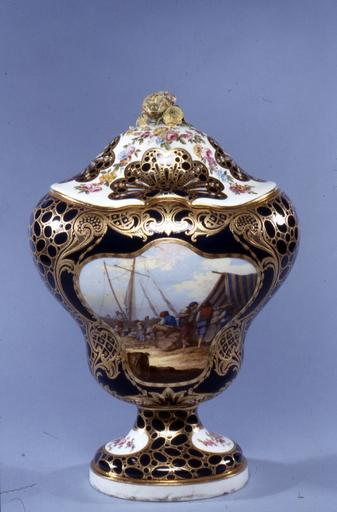| Keywords: Sèvres Porcelain Manufactory - Potpourri Vase (Vase potpourri Hébert) - Walters 48577.jpg The model for this vase still preserved at the Sèvre manufactory is labeled vase à cartels modèle de Hébert T J Hébert was an 18th-century art dealer The harbor scene is by J L Morin The bleu lapis ground color has been gilded in a caillouté or pebbled pattern between 1760 1765 soft-paste porcelain cm 35 5 accession number 48 577 6202 E M Hodgkins Collection Paris no 24 date and mode of acquisition unknown A Seligmann Rey and Co New York Henry Walters city Baltimore Walters Art Museum Henry Walters Acquired by Henry Walters Modeler's Mark Impressed in base cn possibly for Charles Cejourné répareur and sculptor place of origin Sèvres France Walters Art Museum license Sèvres porcelain in the Walters Art Museum Potpourri vases Jean-Louis Morin |