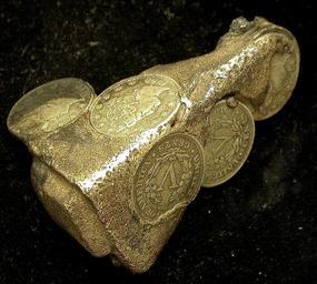 | Keywords: SFCashboxSlag.jpg Pictured is a lump of silver slag removed from a charred cashbox in San Francisco after the Great Earthquake and Fire of 1906 The silver coinage melted but due to their higher melting-point the nickels retained their details and were embedded in molten metal A stray screw was apparently also in the box and was entombed as well This interesting artifact illustrates the enormous heat generated by the fires that swept through the city after the quake own 1/11/08 Matt7949 San Francisco earthquake of 1906 |