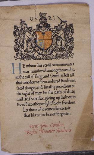 | Keywords: Sgt. John Condon, Tralee, Co. Kerry (Royal Munster Fusiliers), item 1.jpg My grandfather's name was John Condon He was a soldier before the First World War We think he was returned on the census for Ballymullen Barracks as a soldier in the Royal Munster Fusiliers in 1901 His army number in the census in 1901 was 4152 He was a private and aged 23 born circa 1878 He married my grandmother Margaret Murphy on 6th July 1905 She lived next door to the barracks in Giles Lane Ballymullen and several members of her family were also members of the Royal Munster Fusiliers John had left the army at this point but was possibly in the reserves He must have rejoined the Munsters at some point between 1911 and 1914 because in January 1914 he was awared the long service good conduct medal and made up to Sergeant see picture of officers at Ballymullen Barracks Tralee circa 1914 In 1914 he was in the 3rd Battalion Royal Munster Fusiliers and his number was 2591 In the photo he is pictured in dress uniform with his good conduct medal We think this photo was taken shortly after he received his medal as the uniform looks new and his children are approximately the correct ages The girl sitting on his knee is his daughter Julia Condon born 1907 and the young boy is his son John Condon born in 1906 Some time between 1914 and 1915 he must have been in France as he received the 1914-1915 Mons Star Medal He came home on Furlough at least once in 1916 as the youngest childin the family James my father was born in February 1917 My grandmother used to talk about getting postcards from Wipers from him during the war He talked of setting up a business with a French soldier making sweets Sweet making was in my grandmother's family but my grandfather had met a French soldier who knew how to make chocolate While most of the postcards have been lost over the years we have one exapmple that John sent to his wife It has Remembrance and Flowers embroidered on the front His simple message on the back was from husband to wife and children I remember another postcard from him that I saw in my grandmother's house which had written on the back keep children at school Some time in approximately 1916 he came back to Tralee and had his picture taken in combat uniform The photographs of the children were taken in approximately 1916 and 1917 and copies were probably sent to him at the front The group shot of the children shows from left to right Julia Condon born 1907 infant Michael born 1915 behind infant John born 1906 Patrick born 1913 Mary born 1908 The First Communion photo shows Julia on the left and Mary on the right At some point during the war John transferred to the labour corps His new army number was 451179 According to family stories he was a quarter master but as his military record was burnt we don't know his exact duties while he was in France According to family stories he was gassed while he was in France He was transferred back to Ballymullen Barracks 3 weeks before his death approx Nov 6 1918 He was ill - according to his death certificate he had influenza however his son Paddy Patrick who went to see him at the barracks before he died thought he had enterric fever dysentery He is buried in Rath Cemetery Tralee Co Kerry John was not a native of Tralee Clonmel may be his parish of origin but after 15 years research we have not found his bith certificate or baptism certificate We think he was born between 1875 and 1882 We think his father was called Denis Condon and his mother was Mary He possibly had a brother called James Condon nicknamed Whistling Jim When he wasn't in the army John Condon worked as a dealer He bought and sold goods tableware sweets fruit at fairs and markets around Kerry exhibition history object history object type Europeana 1914-1918 Copyright information Europeana 1914-1918 PD-own upload Europeana claims no rights in its digitisation in accordance with its http //pro europeana eu/publications/the-europeana-public-domain-charter Public Domain charter Europeana 1914-1918 project place of creation place of discovery http //www europeana1914-1918 eu/en/contributions/3562 Sgt John Condon Tralee Co Kerry Royal Munster Fusiliers item 1 Uploaded with GWToolset Sgt John Condon Tralee Co Kerry Royal Munster Fusiliers item 1 http //www europeana1914-1918 eu/attachments/46931/3562 46931 full jpg World War I World War I chemical warfare Military medical services in World War I World War I commemoration Europeana 1914-1918 batch upload needs checking |