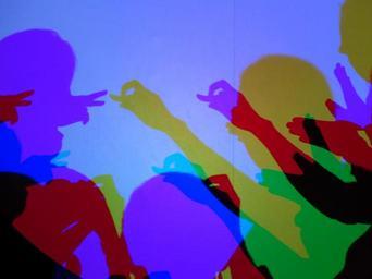 Keywords: shadow shadow play hands figures colorful colored shadow mixed colours farbmischung additives penumbra heads silhouettes personal human men women