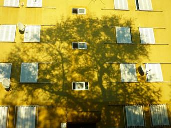 Keywords: shadow tree silhouette facade sunset projection housing floor block windows blinds closed yellow residential district