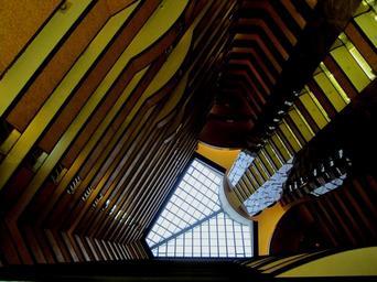 Keywords: shaft light staged light green brown slats sky window reduction abstract