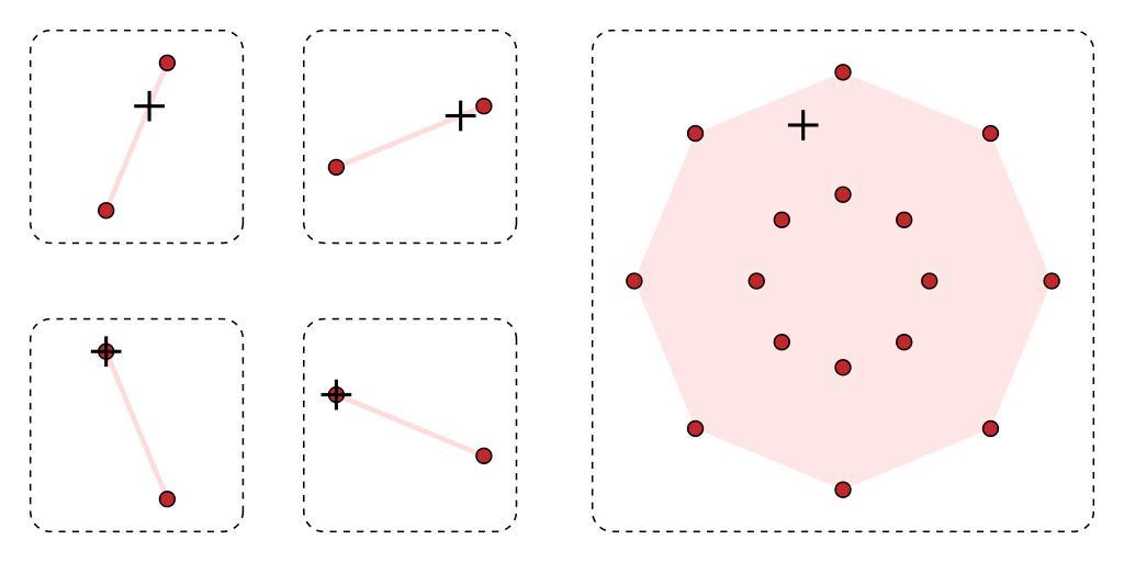 | Keywords: Shapley–Folkman lemma.svg validSVG Shapley “Folkman lemma The sixteen dark red points on the right are the Minkowski sum of the four nonconvex sets on the left each of which consists of a pair of red points The plus sign marks a point belonging to the shaded convex hull of the Minkowski sum; according to the lemma this point may be represented as a sum of four points one for each term in the Minkowski sum Because the ambient space is two-dimensional two of these four points belong to the convex hulls of their summands and the remaining two belong to the summands themselves own David Eppstein Minkowski sum Files by User David Eppstein from en wikipedia |