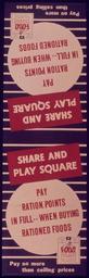 | Keywords: SHARE AND PLAY SQUARE. PAY RATION POINTS IN FULL - WHEN BUYING RATIONED FOODS. PAY NO MORE THAN CEILING PRICES. - NARA - 515392.tif Scope and content General notes 515392 Local identifier 44-PA-1722 Office for Emergency Management Office of War Information Domestic Operations Branch Bureau of Special Services 03/09/1943 - 09/15/1945 Still Picture Records Section Special Media Archives Services Division NWCS-S National Archives at College Park 8601 Adelphi Road College Park MD 20740-6001 1941 - 1945 Record group Record Group 44 Records of the Office of Government Reports 1932 - 1947 Record group ARC 373 World War II Posters compiled 1942 - 1945 Series ARC 513498 File unit File unit ARC Variant control numbers NAIL Control Number NWDNS-44-PA-1722 yes Other versions <gallery> File SHARE_AND_PLAY_SQUARE _PAY_RATION_POINTS_IN_FULL_-_WHEN_BUYING_RATIONED_FOODS _PAY_NO_MORE_THAN_CEILING_PRICES _-_NARA_-_515392 tif tif File SHARE_AND_PLAY_SQUARE _PAY_RATION_POINTS_IN_FULL_-_WHEN_BUYING_RATIONED_FOODS _PAY_NO_MORE_THAN_CEILING_PRICES _-_NARA_-_515392 jpg jpg </gallery> NARA-cooperation PD-USGov World War II posters from the United States NARA TIF images with categorized JPGs |