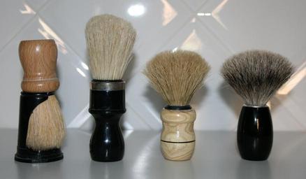 Keywords: Shaving brushes comparison.jpg en Different shaving brushes from left bristle on drying support bristle horse pure badger it Confronto tra differenti pennelli da barba Da sinistra pennello in setola di maiale su supporto maiale cavallo e tasso own Incuso 2011-08-26 Shave brushes Badger products